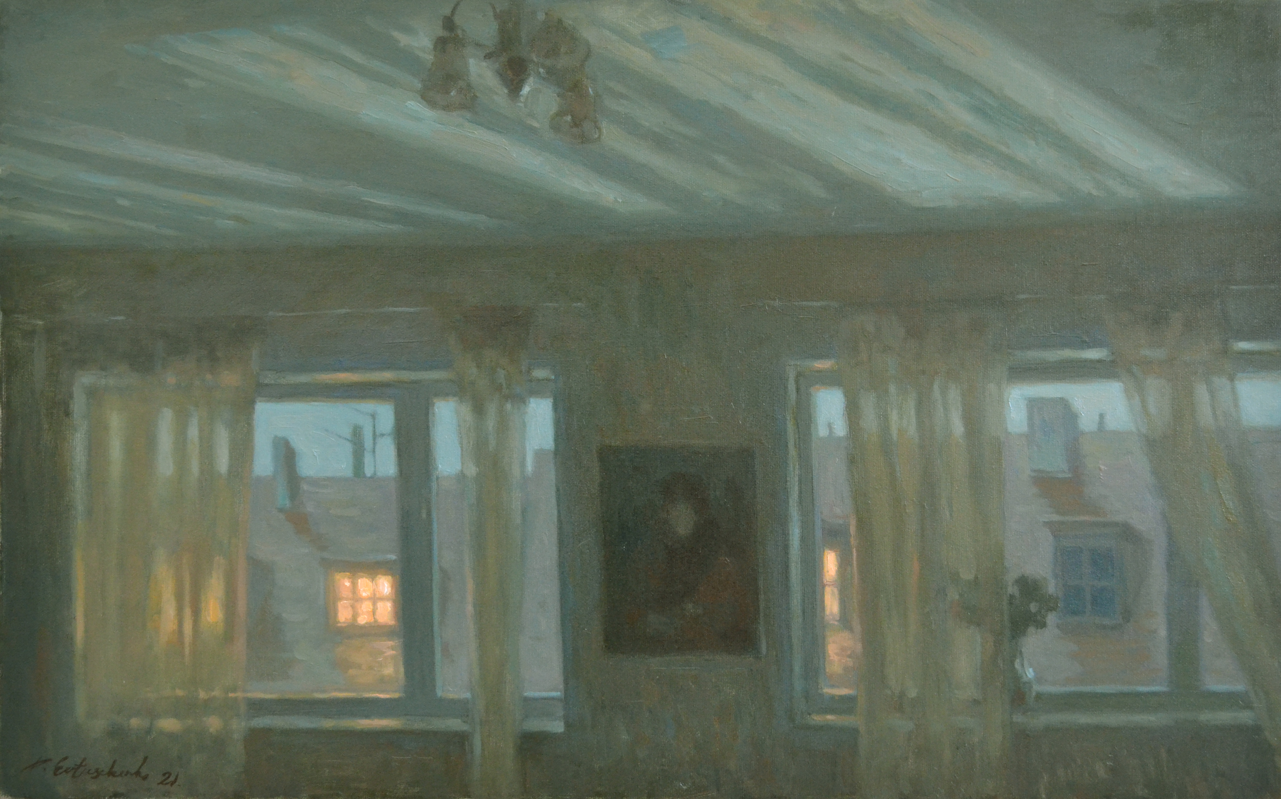 Cars passing under the windows early in the morning. Canvas, oil. 70x50. 2021
