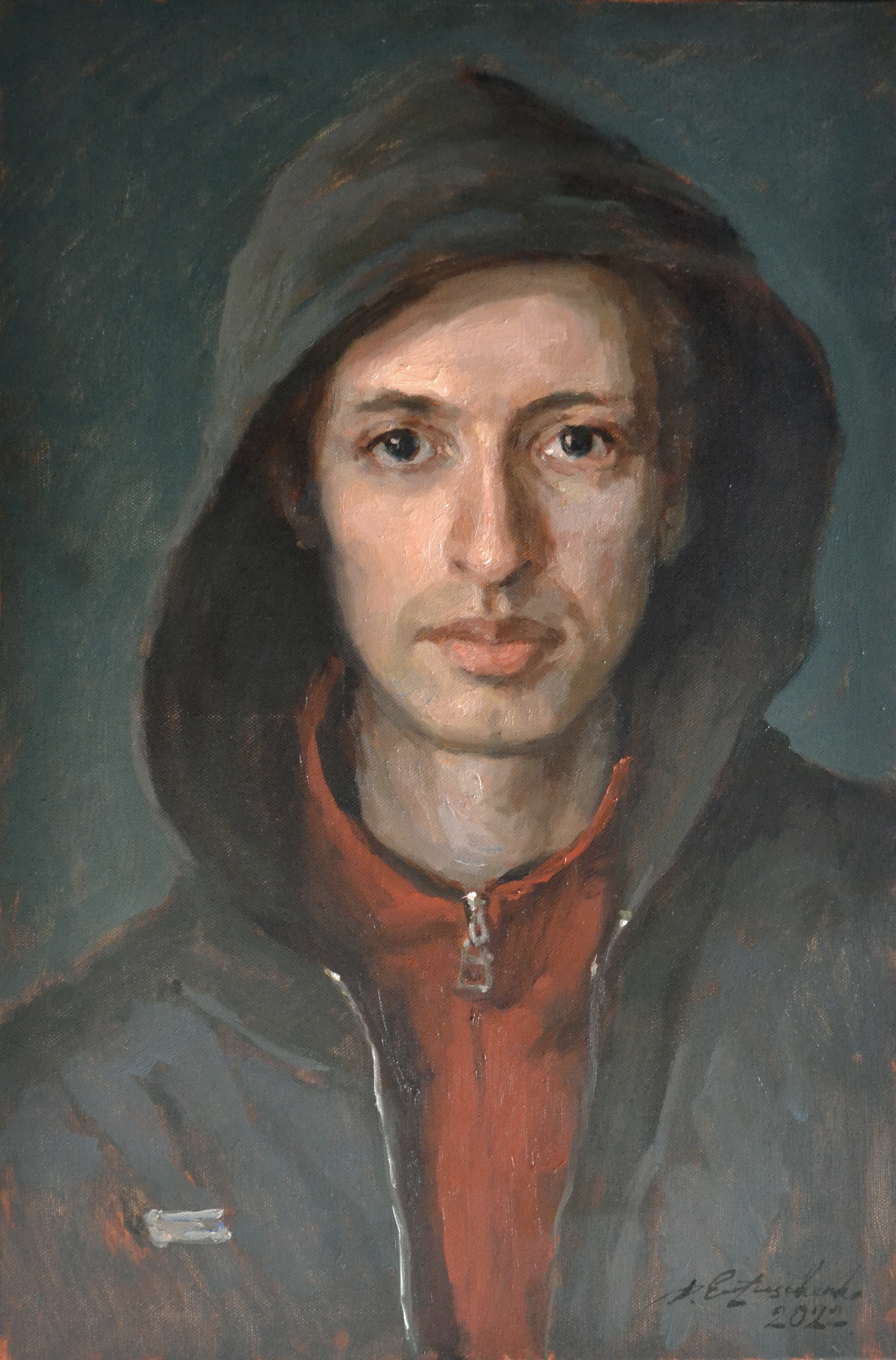 Self-portrait in a hood. Canvas, oil. 60x40. 2022