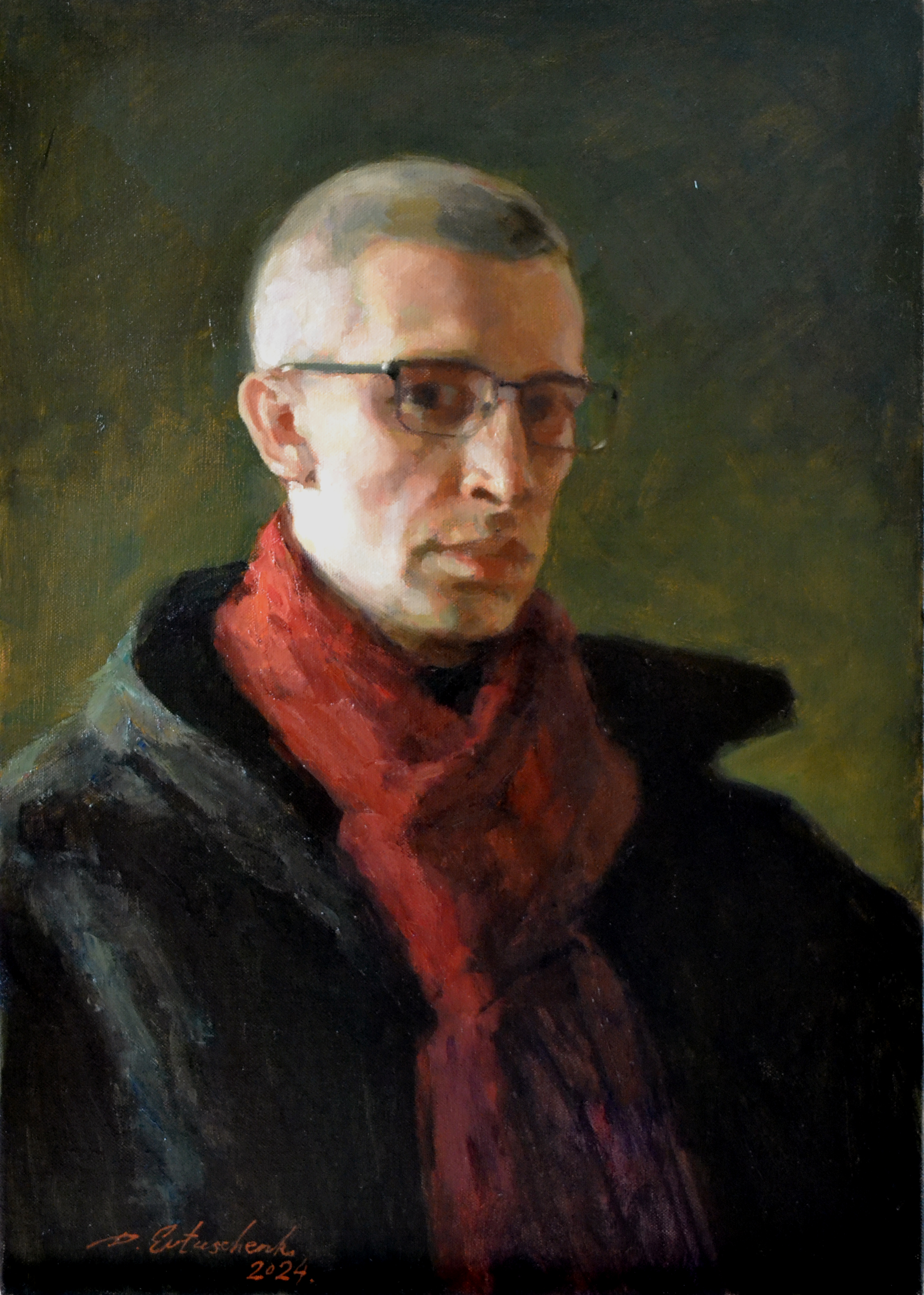 Self-portrait with glasses and scarf. Canvas, oil. 76x53. 2024